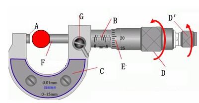 2)左手持尺架(C),右手轉動粗調旋鈕D使測桿F與測砧A間距稍大于被測物,放入被測物,轉動保護旋鈕D′到夾住被測物,直到棘輪發出聲音為止,撥動固定旋鈕G使測桿固定后讀數。
