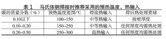 表1是按含碳量分級(jí)推薦的預(yù)熱溫度、熱輸入等。