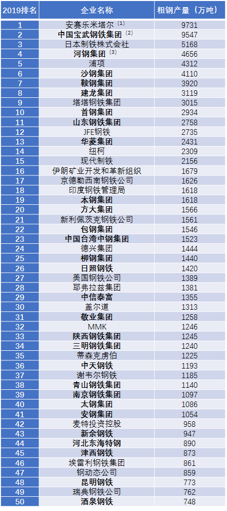 從上榜中國企業數量來看,2019年全球粗鋼產量前10名的鋼鐵企業中,中國有6家鋼鐵企業上榜(分別是:中國寶武、河鋼集團、沙鋼集團、鞍鋼集團、建龍集團、首鋼集團),與2018年持平;前50大鋼企中,中國上榜28家,與2018年持平。
