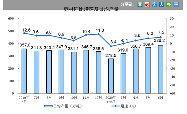 國家統(tǒng)計局?jǐn)?shù)據(jù)顯示,2020年6月份我國粗鋼日均產(chǎn)量305.3萬噸,6月份生鐵日均產(chǎn)量255.5萬噸,6月鋼材日均產(chǎn)量386.2萬噸,環(huán)比5月份分別增長2.56%、2.42%和4.52%,再次全面刷新歷史新高。