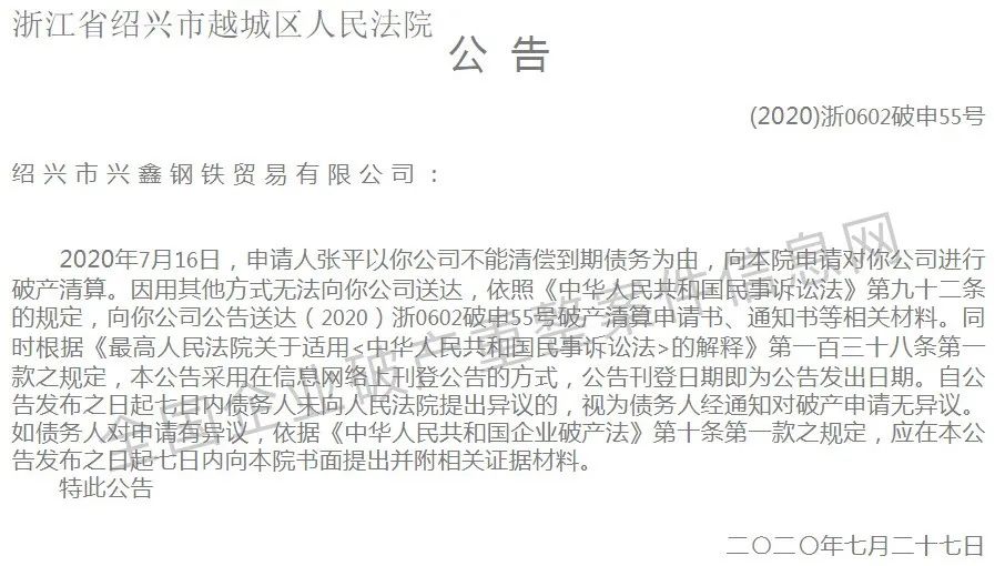 紹興市興鑫鋼鐵貿易公司被申請破產