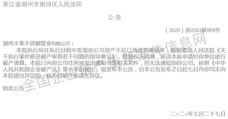湖州豐泰不銹鋼管業有限公司被進行破產清算
