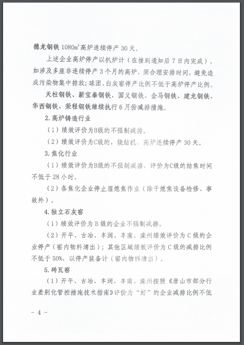 按照《唐山市部分行業(yè)差別化管控措施技術(shù)指南》評(píng)價(jià)為“好”的鼓勵(lì)自主減排,評(píng)價(jià)為“差”的減排比例不低于50%;所有企業(yè)每日22時(shí)至次日8時(shí)停止生產(chǎn)。除保安全生產(chǎn)車輛以外,其余重型貨車禁止運(yùn)輸。每日廠區(qū)灑水、清掃次數(shù)不少于6次,保障廠區(qū)內(nèi)地面不起塵。
