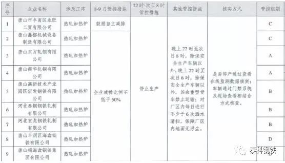 唐山市政府于7月31日發(fā)布《唐山市2020年8-9月空氣質(zhì)量保障方案》的相關(guān)草案,官方正式文件我們?cè)谶M(jìn)一步跟蹤核實(shí),草案具體管控措施如下:1、核心區(qū)(國(guó)控點(diǎn)5平方公里范圍內(nèi))管控措施核心管控區(qū)內(nèi)共有涉氣污染源1094個(gè),鋼鐵企業(yè)1家、電力企業(yè)1家、建筑工地115個(gè)、拆遷工地1個(gè)、加油站20個(gè)、柴油車及工程機(jī)械125輛、餐飲700家、涉VOCs企業(yè)9家、汽修店79家、天然氣鍋爐37臺(tái)(1-10 蒸噸,1蒸噸及.以下4臺(tái))、生物質(zhì)鍋爐6臺(tái)(2-10蒸噸),廢氣排放量為35123萬m3/d, VOCs 排放量19. 47 kg/d。①每日22時(shí)至次日8時(shí),燒結(jié)機(jī)機(jī)速不得超過1. 5米/分鐘,料層厚度適當(dāng)降低,通過提高氧化、吸收效率降低氮氧化物排放,氮氧化物小時(shí)均值濃度不得高于40mg/m3; 高爐夜間產(chǎn)量較正常生產(chǎn)下降比例不少于10%;煉鋼工序根據(jù)鐵產(chǎn)量減少出鋼爐數(shù);除保安全生產(chǎn)車輛以外,其余重型貨車禁止運(yùn)輸。②每日廠區(qū)灑水、清掃次數(shù)不少于6次,保障廠區(qū)內(nèi)地.面不起塵。