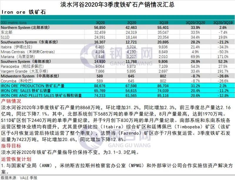 一. 淡水河谷 北方系統(tǒng) 由Serra Norte,Serra Leste和S11D礦山組成的北方系統(tǒng)在2020年第三季度的產(chǎn)量為5685萬(wàn)噸,創(chuàng)下單季產(chǎn)量季度。 主要由于: S11D的強(qiáng)勁表現(xiàn)和創(chuàng)紀(jì)錄的業(yè)績(jī); Serra Norte在6月和7月進(jìn)行維護(hù),盡管三季度開始時(shí)產(chǎn)量下降,但仍可以提高站點(diǎn)生產(chǎn)力; 該地區(qū)天氣狀況良好,降雨水平較低; 確保生產(chǎn)穩(wěn)定性。 預(yù)計(jì)將在短期內(nèi)獲得恢復(fù)Serra Leste運(yùn)營(yíng)許可,并進(jìn)行維護(hù)以安全地恢復(fù)運(yùn)營(yíng),直至2020年底。Serra Leste運(yùn)營(yíng)自2019年1月起已停止,恢復(fù)運(yùn)營(yíng)將總計(jì)600萬(wàn)噸產(chǎn)能。 東南系統(tǒng) 包括Itabira,Minas Centrais和Mariana采礦中心在內(nèi)的東南系統(tǒng)在2020年第三季度實(shí)現(xiàn)了1630萬(wàn)噸產(chǎn)量。 三季度產(chǎn)量水平提高主要由于: COVID-19影響有限,導(dǎo)致6月Itabira Complex臨時(shí)停工12天和100萬(wàn)噸產(chǎn)量損失; Timbopeba運(yùn)營(yíng)于6月重新開始,整個(gè)季度有400萬(wàn)噸產(chǎn)能運(yùn)行; 7月恢復(fù)了Fazend?o礦山運(yùn)營(yíng); 季節(jié)性天氣穩(wěn)定。 南方體系 包括Paraopeba和Vargem Grande采礦中心在內(nèi)的南方系統(tǒng)在2020年第三季度的產(chǎn)量為1493萬(wàn)噸,產(chǎn)量環(huán)比增加主要由于: 二季度通過(guò)使用尾礦過(guò)濾將濕法生產(chǎn)的部分恢復(fù)使用Maravilhas I壩和Cianita垃圾堆作為初步解決方案之后,Vargem Grande綜合產(chǎn)量有所提高。 季節(jié)性購(gòu)買力增強(qiáng)。 二. 必和必拓 礦山項(xiàng)目 西皮爾巴拉地區(qū)Jimblebar礦山產(chǎn)量突破新高。三季度三號(hào)卸料車維修工作按計(jì)劃完成, 四季度將繼續(xù)四號(hào)卸料車的維修工作。同時(shí)MAC 和South Flank礦區(qū)交接或?qū)?duì)產(chǎn)量產(chǎn)生一定影響。此外,巴西Samarco礦區(qū)依然處于停產(chǎn)狀態(tài),復(fù)產(chǎn)時(shí)間尚未確定。