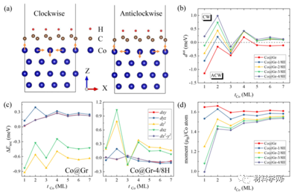 圖2.(a) Co(4ML)/Gr-4/8H的CW和ACW示意圖,箭頭表示旋轉方向;(b)表示不同氫濃度DMI對Co層厚度的變化;(c)Co/graphene和Co/graphene-4/8H中與DMI相關的SOC能量隨Co厚度的變化;(d)不同氫濃度下Co原子的平均磁矩隨厚度的變化