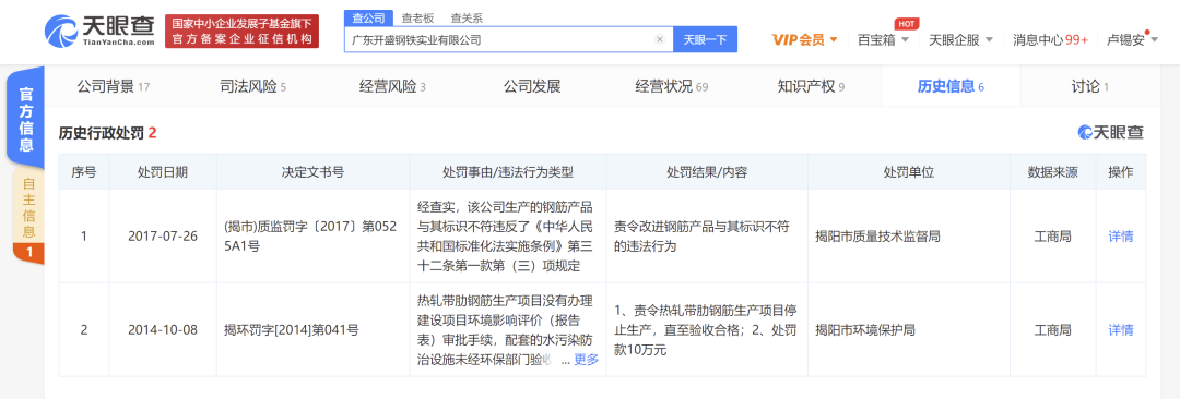 此外,2017年7月,該公司被揭陽市質(zhì)量技術(shù)監(jiān)督局處罰,事由為“該公司生產(chǎn)的鋼筋產(chǎn)品與其標(biāo)識不符違反了《中華人民共和國標(biāo)準(zhǔn)化法實施條例》第三十二條第一款第(三)項規(guī)定”,被工商局責(zé)令改進鋼筋產(chǎn)品與其標(biāo)識不符的違法行為。