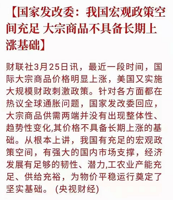 財聯(lián)社3月25日訊,全球通脹問題受熱議,國家發(fā)改委回應(yīng):我國宏觀政策空間充足,大宗商品不具備長期上漲基礎(chǔ)。