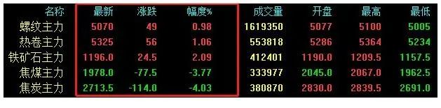 期鋼今日小幅上探,期螺上漲49收報5070,期卷上漲56收報5325,鐵礦石上漲24.5收報1196,焦煤下跌77.5收報1978,焦炭下跌114收報2713.5。