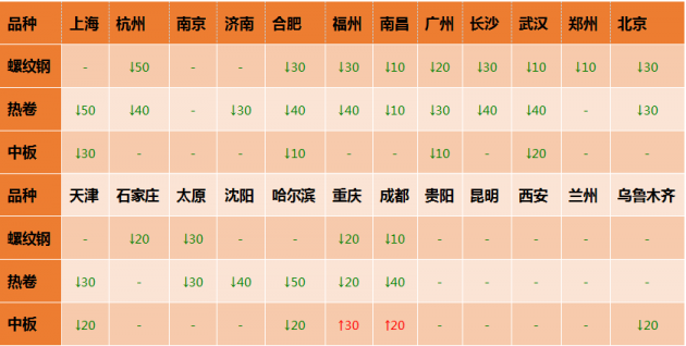 現(xiàn)貨報價普遍下調,跌幅50以內: