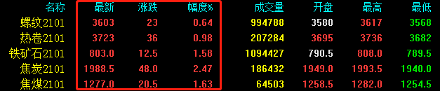 今日期貨全面翻紅,期螺漲23收報3603,期卷漲36收報3723,鐵礦石漲12.5收報803,焦炭漲48收報1988.5,焦煤漲20.5收報1277。