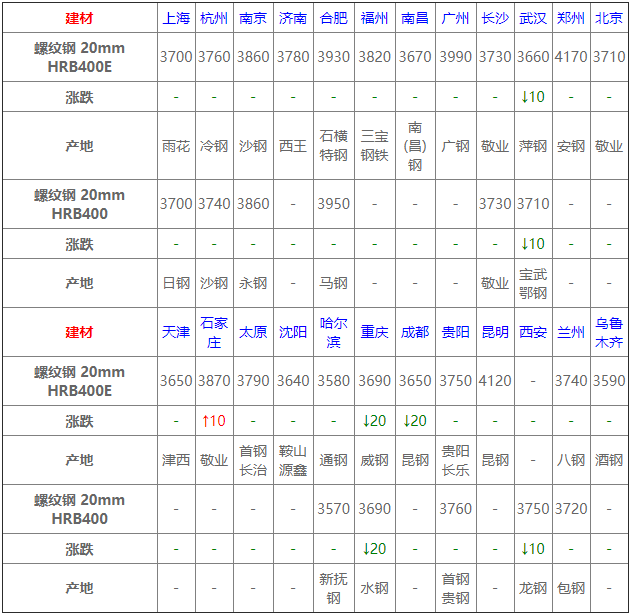 螺紋鋼24個市場中4個市場下跌10-20,1個市場上漲10,螺紋鋼20mm HRB400E平均價格3776元/噸,較上個交易日下調2元/噸;