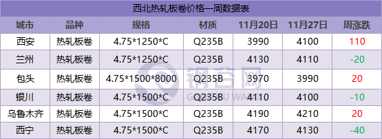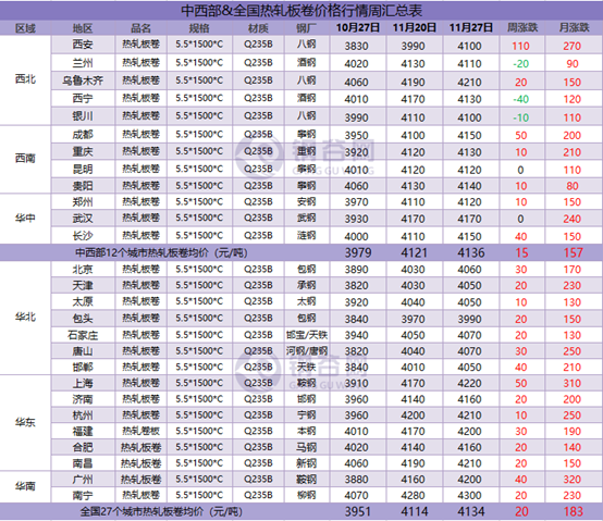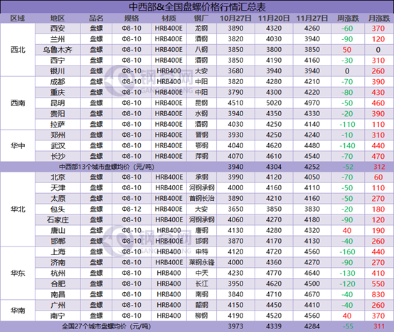 據鋼谷網數據監測,本周全國主要城市鋼材市場價格盤整運行,調整空間10-160元/噸,板材強于長材。截止11月27日,全國27個城市螺紋鋼均價4007元/噸,較上周跌57元/噸;全國27個城市高線均價4206元/噸,較上期跌55元/噸;全國27個城市盤螺均價4284元/噸,較上期跌55元/噸;全國27個城市熱軋板卷均價4134元/噸,較上周漲20元/噸;全國27個城市中厚板均價4051元/噸,較上期漲14元/噸。