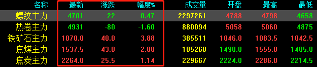 期鋼午后轉跌,期螺下跌22收報4701,期卷下跌80收報4931,鐵礦石上漲40收報1070,焦煤上漲43收報1537.5,焦炭上漲25.5收報2264。
