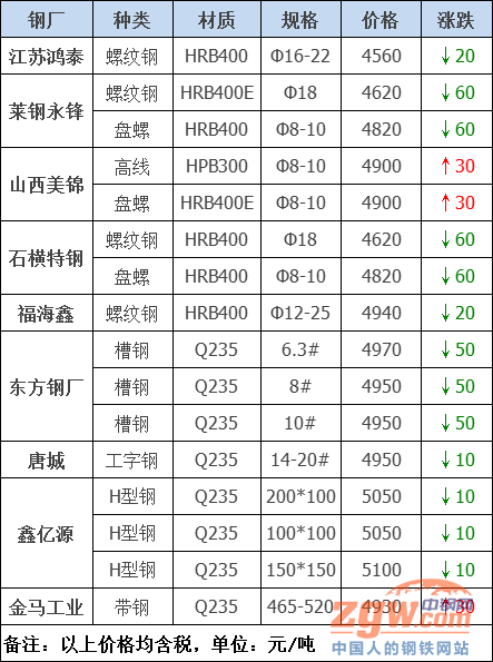 據(jù)數(shù)據(jù)監(jiān)測,今日共20家鋼廠調(diào)價,其中漲幅最高為山西美錦建材,調(diào)價幅度30元/噸,跌幅最大為萊鋼永鋒建材,調(diào)價幅度60元/噸,具體調(diào)價明細如下: