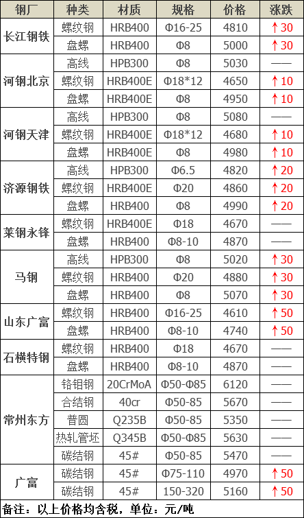 1、華東市場上調50元/噸:角鋼5180元/噸,槽鋼5140元/噸,工字鋼5140元/噸;