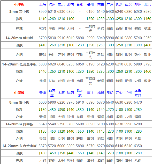 4 5月20日中厚板價格:下調價格; 今全國中板寬幅下跌,幅度300-500左右,暴跌行情商家交投十分謹慎,盤中個別市場有超跌回漲100左右,成交觀望居多;