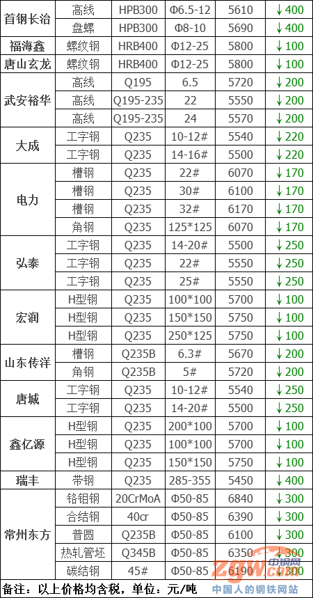 據數據監測,今日共28家鋼廠調價,其中跌幅最大為江蘇雨花線材,調價幅度480元/噸,具體調價明細如下: 鋼廠調價 南鋼螺紋鋼下調200元/噸 新撫鋼建材下調120元/噸 馬鋼建材下調100-200元/噸 萊鋼永鋒建材下調270元/噸 武安裕華高線下調200元/噸 石橫特鋼建材下調270元/噸 首鋼長治建材下調400元/噸 福海鑫螺紋鋼下調100元/噸 江蘇鴻泰螺紋鋼下調170元/噸 唐山玄龍螺紋鋼下調100元/噸 江蘇鴻泰螺紋鋼下調170元/噸 唐山玄龍螺紋鋼下調100元/噸 江蘇雨花建材下調300-480元/噸 山西美錦建材下調300-350元/噸 長江鋼鐵建材下調300-400元/噸 河鋼天津建材下調280-300元/噸 河鋼北京建材下調280-300元/噸 山西晉鋼建材下調250-300元/噸 黎城太行建材下調150-200元/噸 電力型材下調170元/噸 弘泰工字鋼下調250元/噸 大成工字鋼下調220元/噸 唐城工字鋼下調250元/噸 宏潤H型鋼下調100元/噸 山東傳洋型材下調200元/噸 鑫億源H型鋼下調100元/噸 瑞豐帶鋼下調400元/噸 常州東方優鋼下調300元/噸 鋼廠調價占比 下調28家,占比100%,調價幅度100-480元/噸。 行情簡評 今日鋼廠價格跌勢加深,期鋼持綠震蕩,低位有所上移。原料方面,普指跌8.3,鐵礦商家心態不佳。廢鋼保持觀望,鋼廠采購量一般。唐山近期有減排措施,部分鋼廠停產,焦煤穩中偏強。市場方面,悲觀氛圍蔓延,商家觀望為主,操作謹慎,但帶鋼跌后部分資源成交尚可,價格有企穩跡象。預計短期鋼廠價格穩中偏弱。