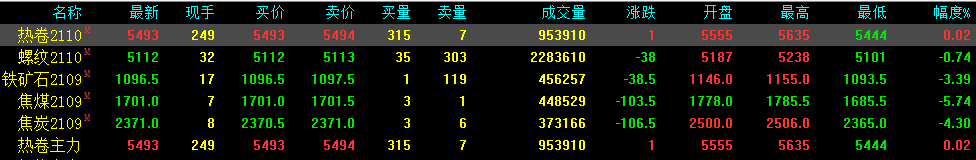 期卷期螺高開低走,期螺小幅下跌38收報(bào)5112,期卷小漲1收報(bào)5493,鐵礦石下跌38.5收報(bào)1096.5,焦煤下跌103.5收報(bào)1701,焦炭下跌106.5收報(bào)2371。