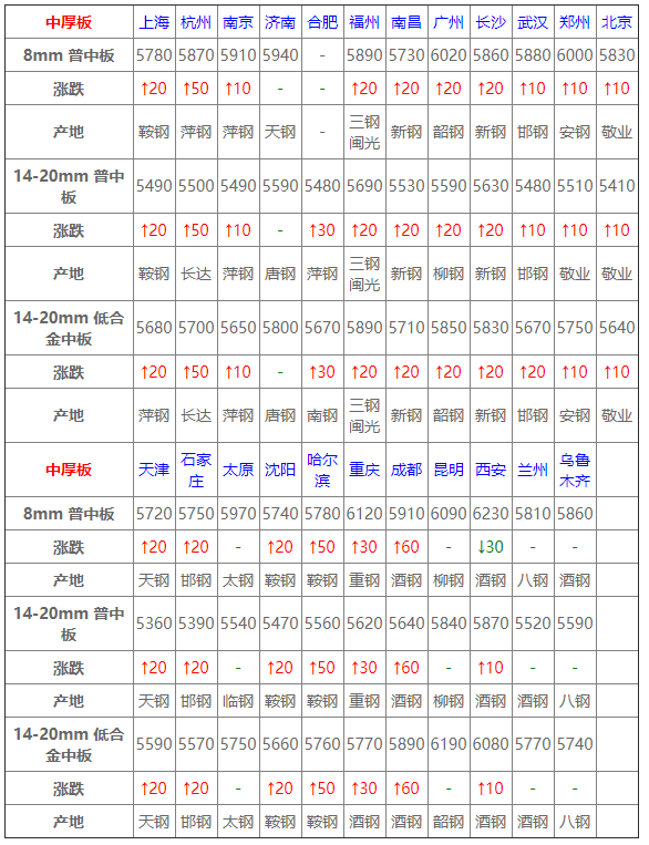 4 6月10日中厚板價格:主流上調; 今全國中板穩中偏強,波動幅度10-60,期貨持紅向上,商家多為出貨為主,下游需求偏弱,市場詢價較昨冷清,整體情緒一般;