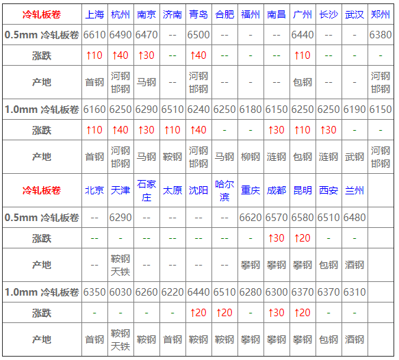 3 6月10日冷軋板卷價格:主流上漲; 今全國冷軋穩中偏強,幅度10-40,相關期貨拉漲,提振冷軋現貨市場,商家操作出現分歧,部分庫存承壓,以出貨為主,挺價意愿不強,成交可優惠,然終端需求釋放不足,觀望情緒較濃,市場實際成交一般;