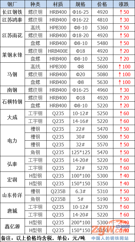 據數據監測,今日共21家鋼廠調價,其中漲幅最高為馬鋼建材,調價幅度100元/噸,具體調價明細如下: 鋼廠調價 山西美錦建材價格平穩 武安裕華高線價格平穩 西王特鋼建材價格平穩 馬鋼建材上調100元/噸 南鋼螺紋鋼上調30元/噸 石橫特鋼建材上調20元/噸 萊鋼永鋒建材上調20元/噸 長江鋼鐵建材上調50元/噸 江蘇雨花建材價格上調50元/噸 江蘇鴻泰建材價格上調30元/噸 電力型材上調50元/噸 宏潤H型鋼上調40元/噸 大成工字鋼上調60元/噸 弘泰工字鋼上調60元/噸 唐城工字鋼上調60元/噸 鑫億源H型鋼上調40元/噸 山東傳洋型材上調50元/噸 天鋼板材價格平穩 普陽中厚板價格平穩 元寶山板材價格平穩 敬業中厚板價格平穩 鋼廠調價占比 上調14家,占比66.7%,調價幅度20-100元/噸。 平穩7家,占比33.3%。 行情簡評 今日鋼廠價格整體上行,季節性需求轉弱,各地區限產范圍擴大,受政策面消息影響,鋼廠對原料采購積極性大幅轉弱。然受成本端上揚提振,鋼坯支撐力度轉強,廠家跟漲操作積極。但隨著百年黨慶臨近,軋鋼企業多停產停運,部分安排放假,市場成交氛圍冷清,預計短期鋼廠價格將堅挺運行為主。