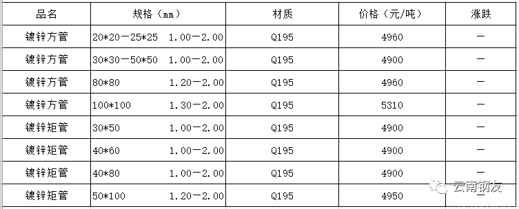 22日昆明市場鍍鋅方矩管價格暫穩觀望,具體如下(過磅):