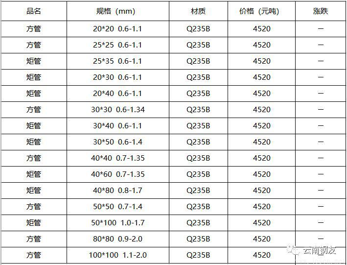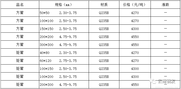 22日昆明市場方矩管價格暫穩觀望,具體如下(過磅):
