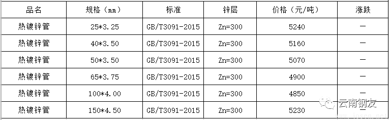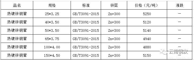 22日昆明市場熱鍍鋅鋼管價格暫穩觀望,具體如下(過磅):