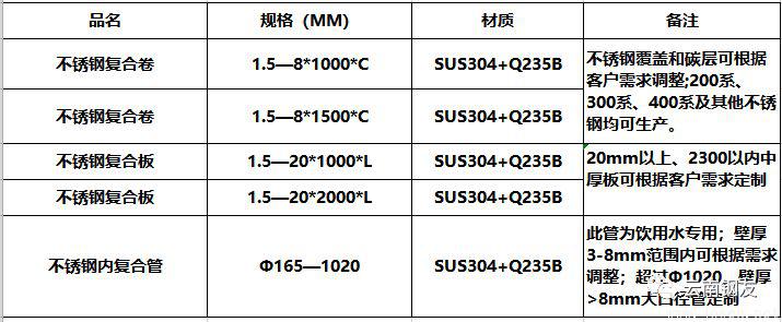 2、不銹鋼復合材料介紹:不銹鋼復合材料不僅具有不銹鋼的耐腐蝕性,表面美觀,而且具有碳鋼良好的機械性能與加工性能,廣泛應用于食品、飲水、釀造、醫藥、消防、能源與環保、石油、化工、煤焦化、鹽化工、水利、電力、建筑、裝飾、印染、化肥、造紙等領域。