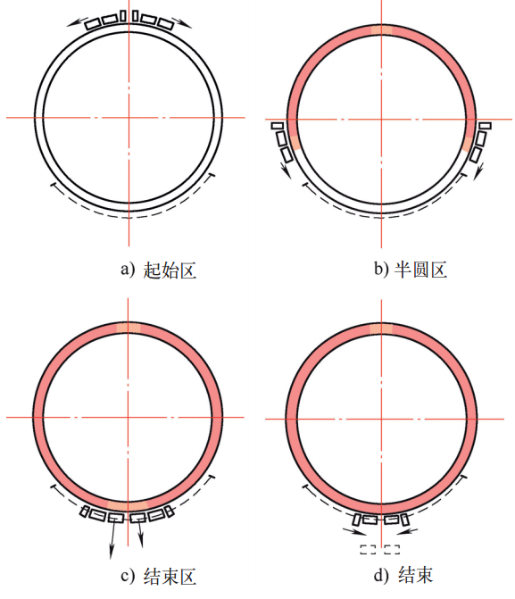 圖1所示為不同工藝步驟中加熱組件的位置。加熱從環形工件的一個點開始,兩個加熱組件彼此靠近,在該區域加熱過程中,旋轉平臺在一定范圍內帶動工件擺動,稱為起始區(見圖1a)。此時,所有感應器緊靠在一起進行加熱。當起始區達到工藝淬火溫度時,旋轉平臺停止擺動,兩個獨立的加熱組件朝相反方向移動。這時,主噴淋器打開,開始快速冷卻起始區表面。在穩定掃描模式下加熱時,每個加熱組件將圍繞軸承圓周一半的圓環移動(見圖1b)。根據工藝要求設置掃描速度和加熱功率,以獲得所需的淬硬層深度。兩個加熱組件沿著軸承輥道相對方向移動,到達與起始區域相對的位置,該區域稱為結束區域。當兩個加熱組件相互靠近時,兩對預熱感應器彼此緊鄰(見圖1c)。此時,第一加熱組件預熱感應器的電源供電中斷,該預熱感應器從輥道表面移開。移開一個感應器為兩個加熱組件創造了更近的加熱空間。當第二個加熱組件的預熱感應器與第一個加熱組件的加熱感應器相鄰時,再次關閉第二個預熱感應器的電源,同時該感應器離開輥道表面。第二個預熱感應器覆蓋的輥道表面,隨后由兩個相互靠近的加熱感應器進行加熱(見圖1d)。當兩個加熱感應器彼此相鄰靠到最近時,電源關閉,并快速移動轉臺平臺,使其中一個輔助淋浴器覆蓋最后一個加熱輥道部分。感應器和輥道表面之間的間隙恒定是獲得均勻加熱模式的基礎。