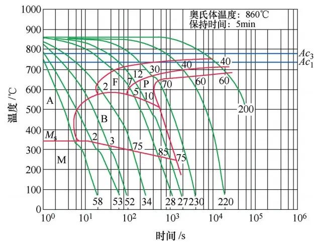 圖2中,冷卻曲線尾部的數字是冷卻后的硬度值,<200的為HRC,200的為HV;貝氏體B、鐵素體F、珠光體P區域的數字為冷卻后相應的金相組織中非馬氏體組織百分比。