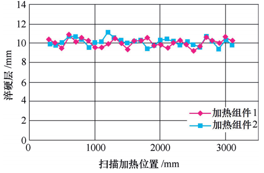 掃描區域的淬硬層深度如圖4所示,從圖中可知獲得了良好的工藝一致性,當平均淬硬層深度值為10mm時,沿圓周方向的淬硬層深度變化約為±2mm: